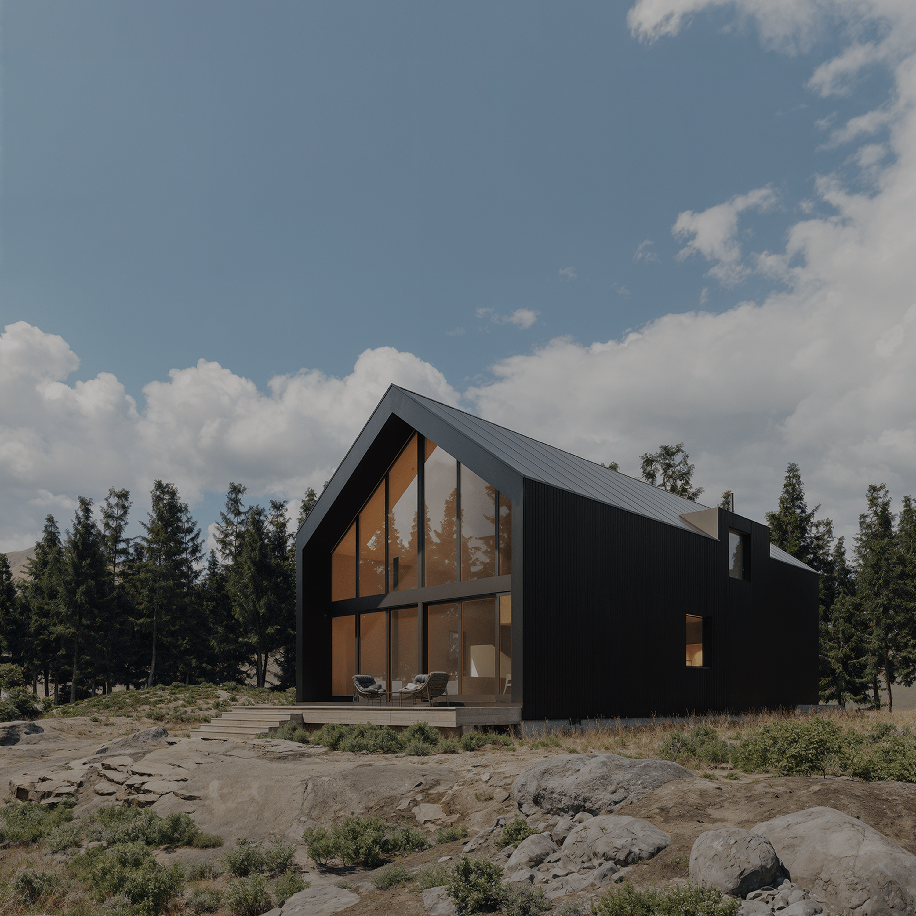 A 3-bedroom mountain retreat with vaulted ceilings and floor-to-ceiling windows, delivered as a prefabricated kit.